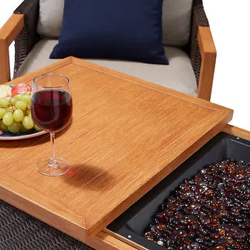 Style your outdoor living space with the elegant and comfortable Galina 4-piece Fire Seating Set from New Garden®. Comes with 2 club chairs and 1 large sofa, this set features a beautiful fire table with a convenient retractable top that is multi-functional and saves space when used as a coffee table. The over-sized seating areas and gently curved chair backs offer the comfort of deep lounging. The rust-free aluminum frames are carefully hand-brushed with a stylish faux-teak pattern. All-weather wicker is woven 100% by hand to create attractive geometric patterns and will withstand years of harsh weather. All cushions and pillows are made of Sunbrella® fabric that is known for its outstanding performance in outdoor environment.